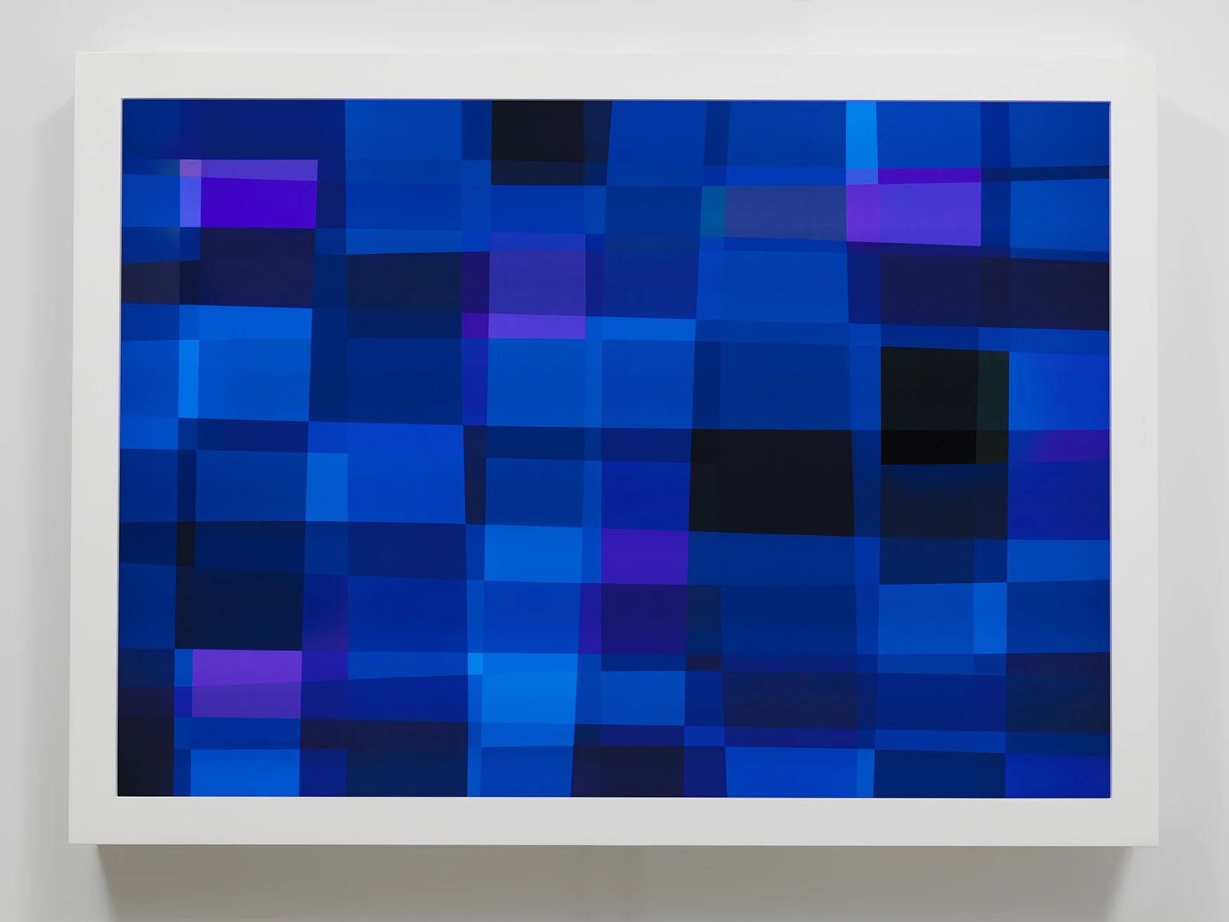 This work was made by layering and laminating two translucent grids of unique colors printed on Fujitrans, in order to form a more complex grid with more complex colors.