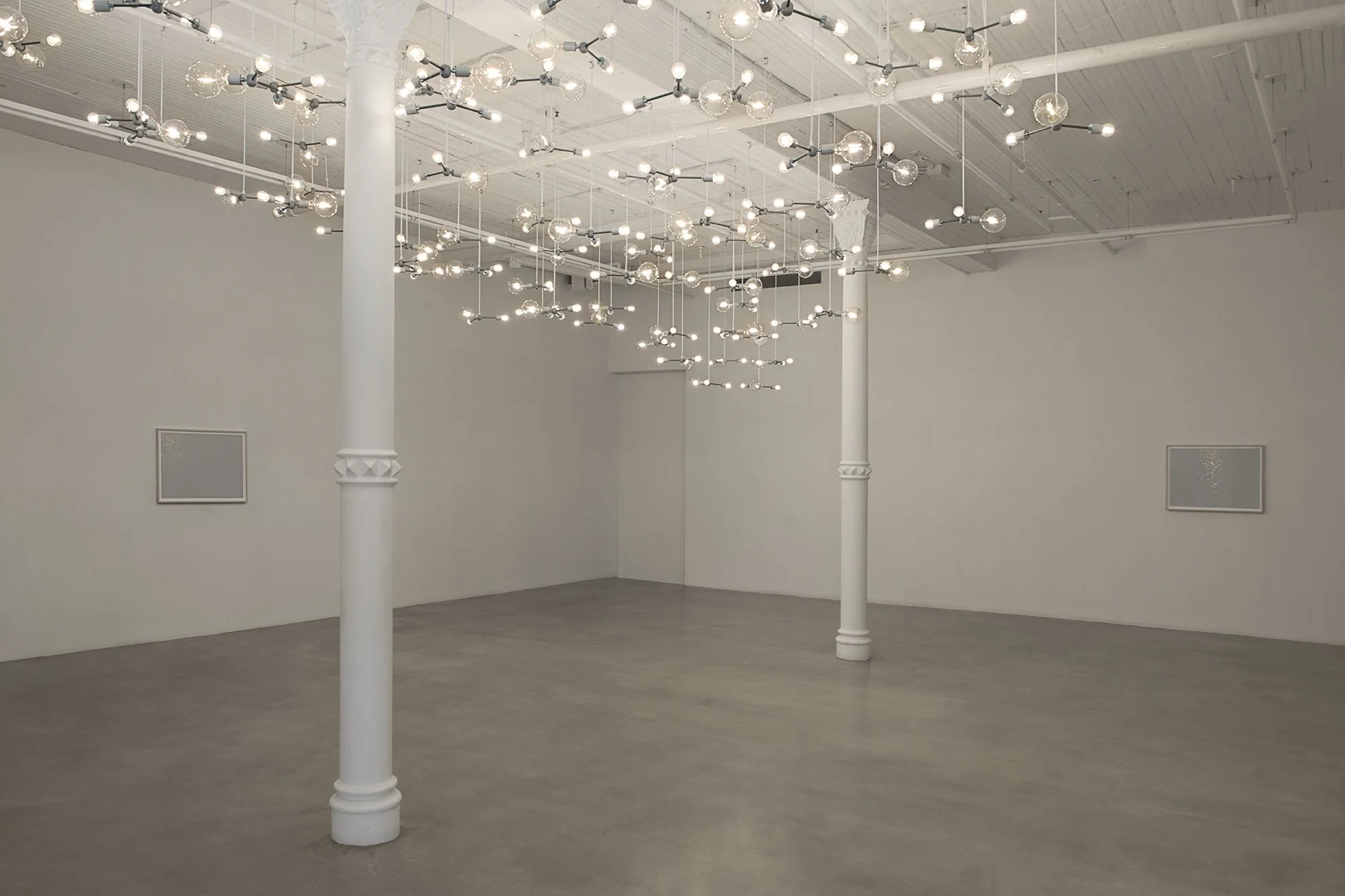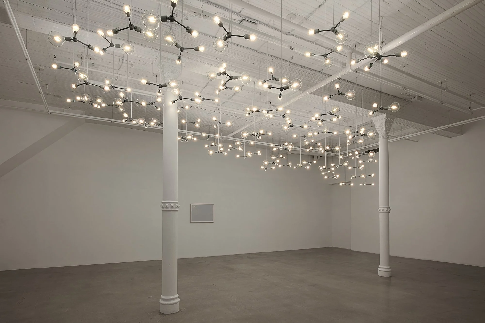 Installed in a cloud-like formation, the light fixtures in this installation function as scale models of the chemical formula of water. The two smaller lamps in each fixture represent hydrogen atoms, while the larger lamp represents an oxygen atom, which has a larger atomic mass.
