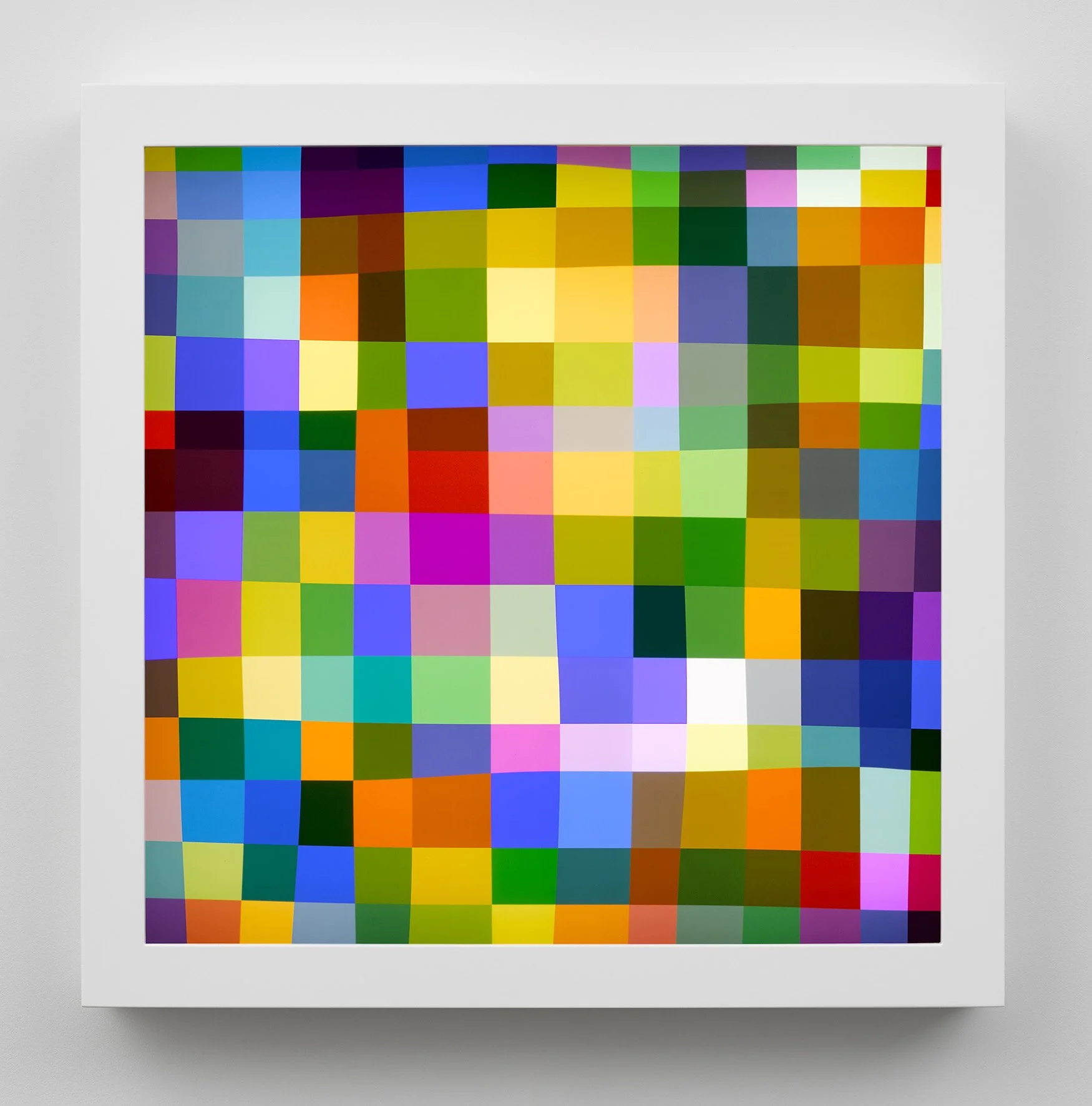 The Color Tests are made by layering and laminating two translucent grids of unique colors printed on Fujitrans, in order to form a more complex grid with more complex colors.