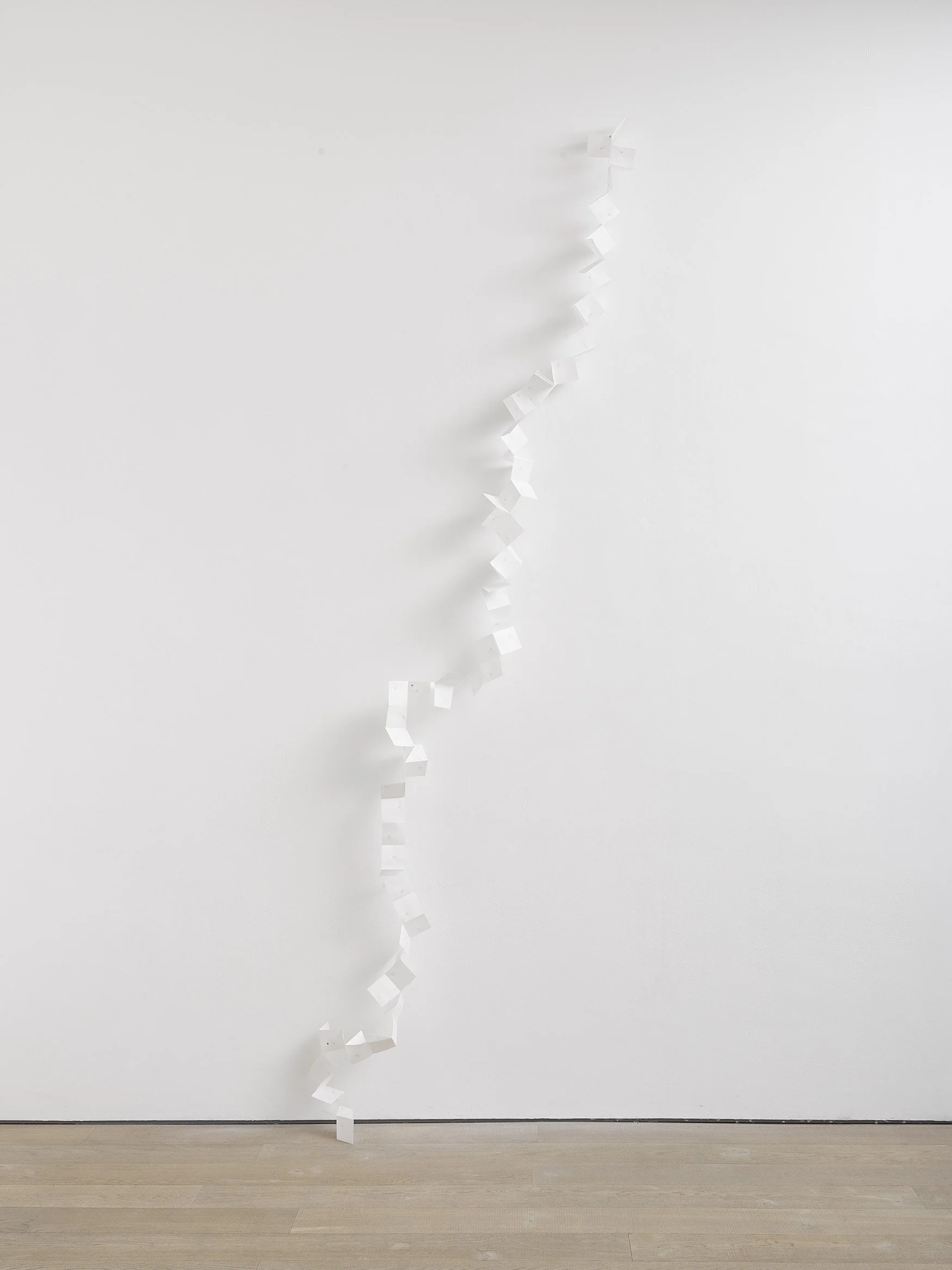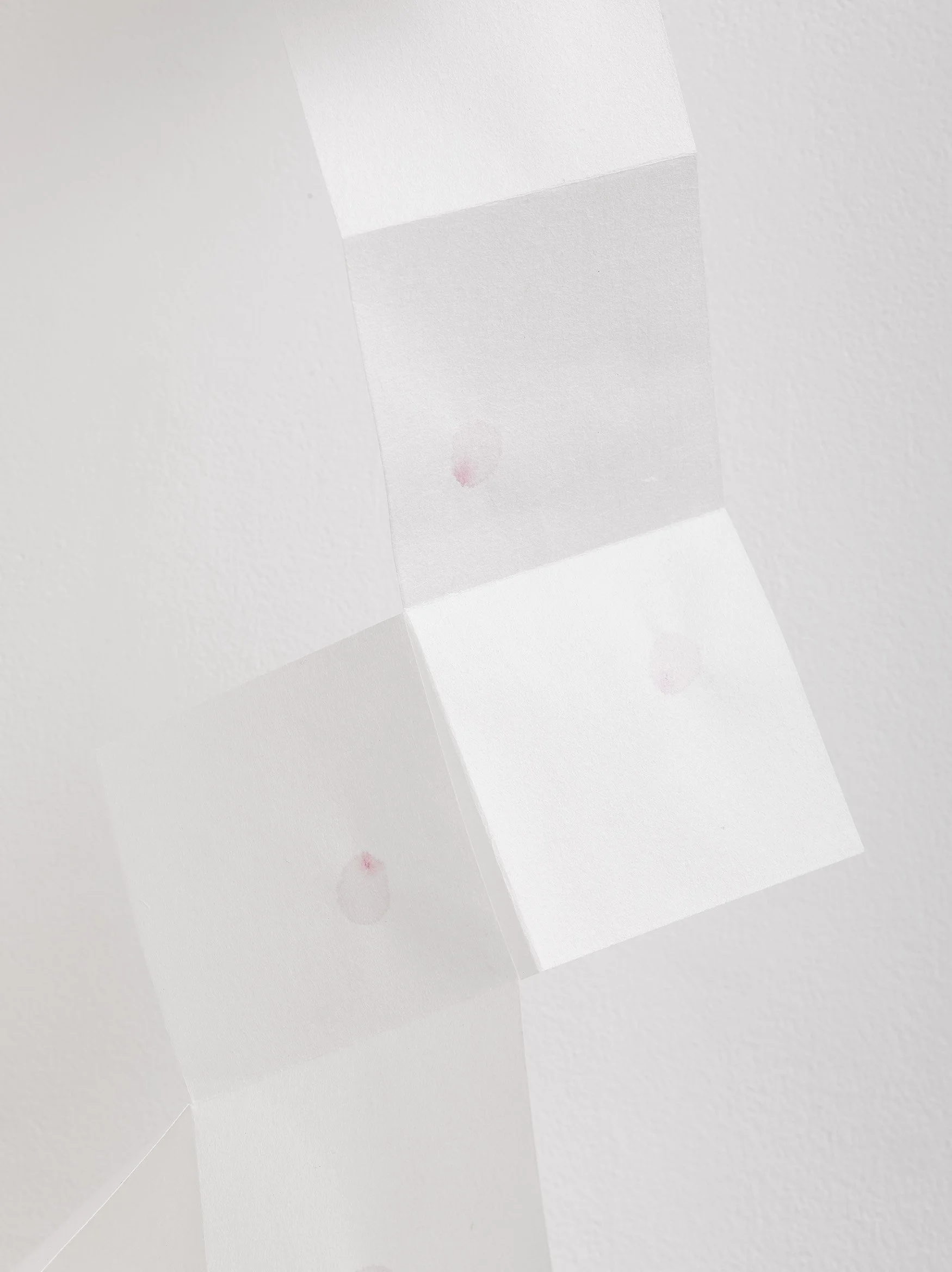 Made from a single sheet of Japanese rice paper, this drawing is of a single cherry blossom petal painted repeatedly. The way the rice paper is folded mimics the trajectory of a leaf as it falls from a tree.