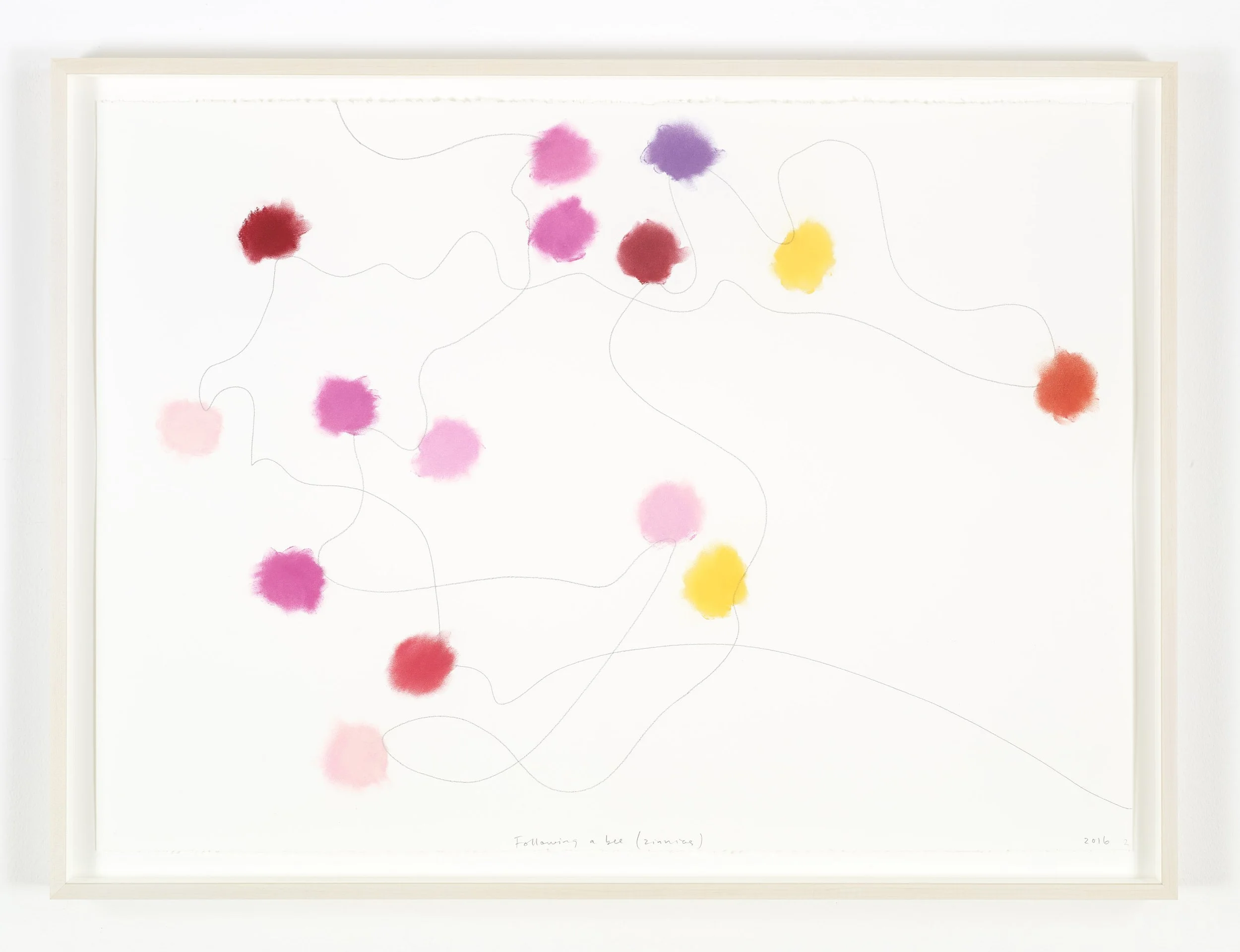 This drawing maps the flight of an individual bee and the flowers of various colors on which it landed.
