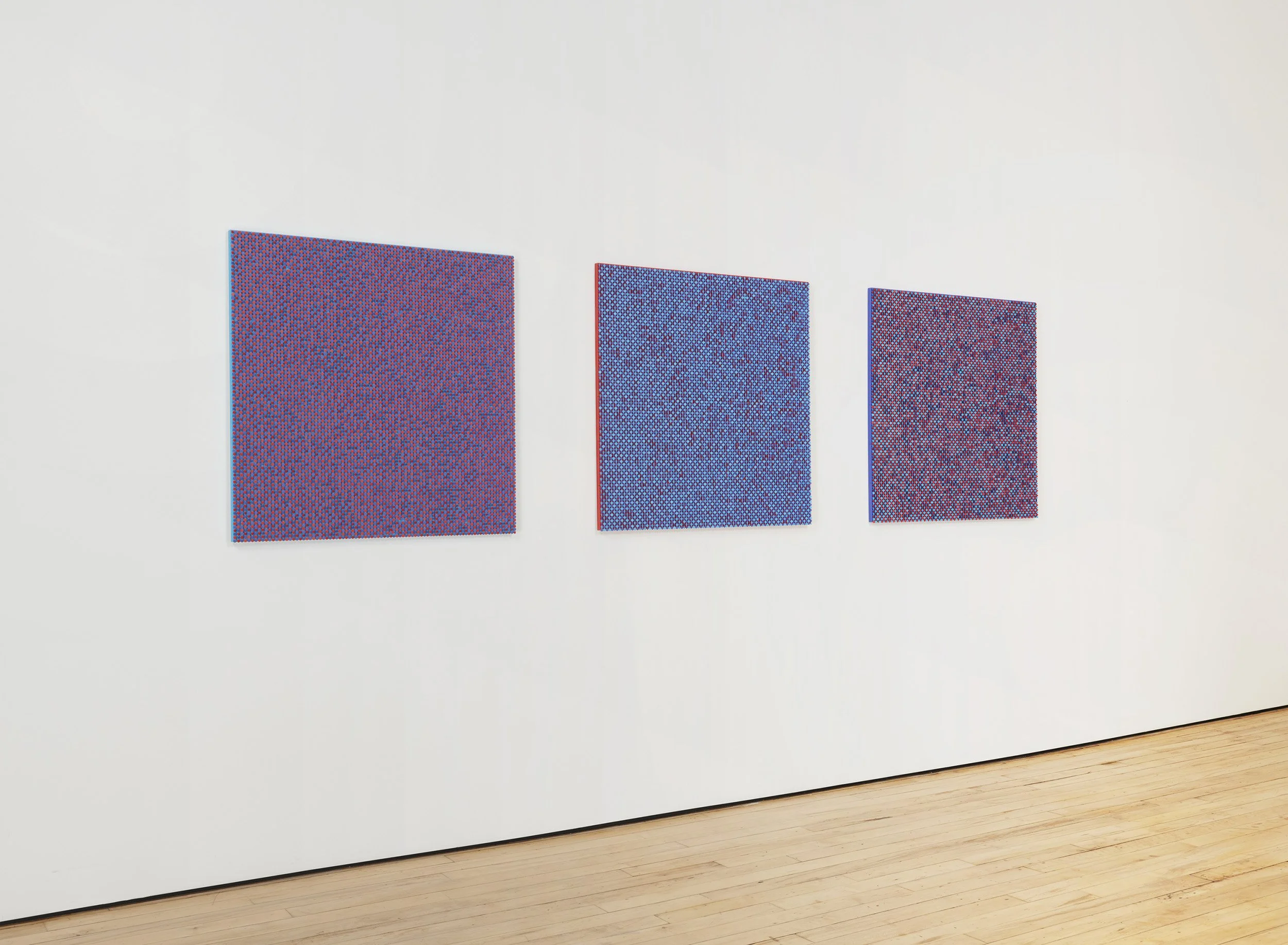 This triptych uses red, blue and violet in three different permutations: a blue panel with alternating red and violet discs, a red panel with alternating blue and violet discs, and a violet panel with blue and red discs.