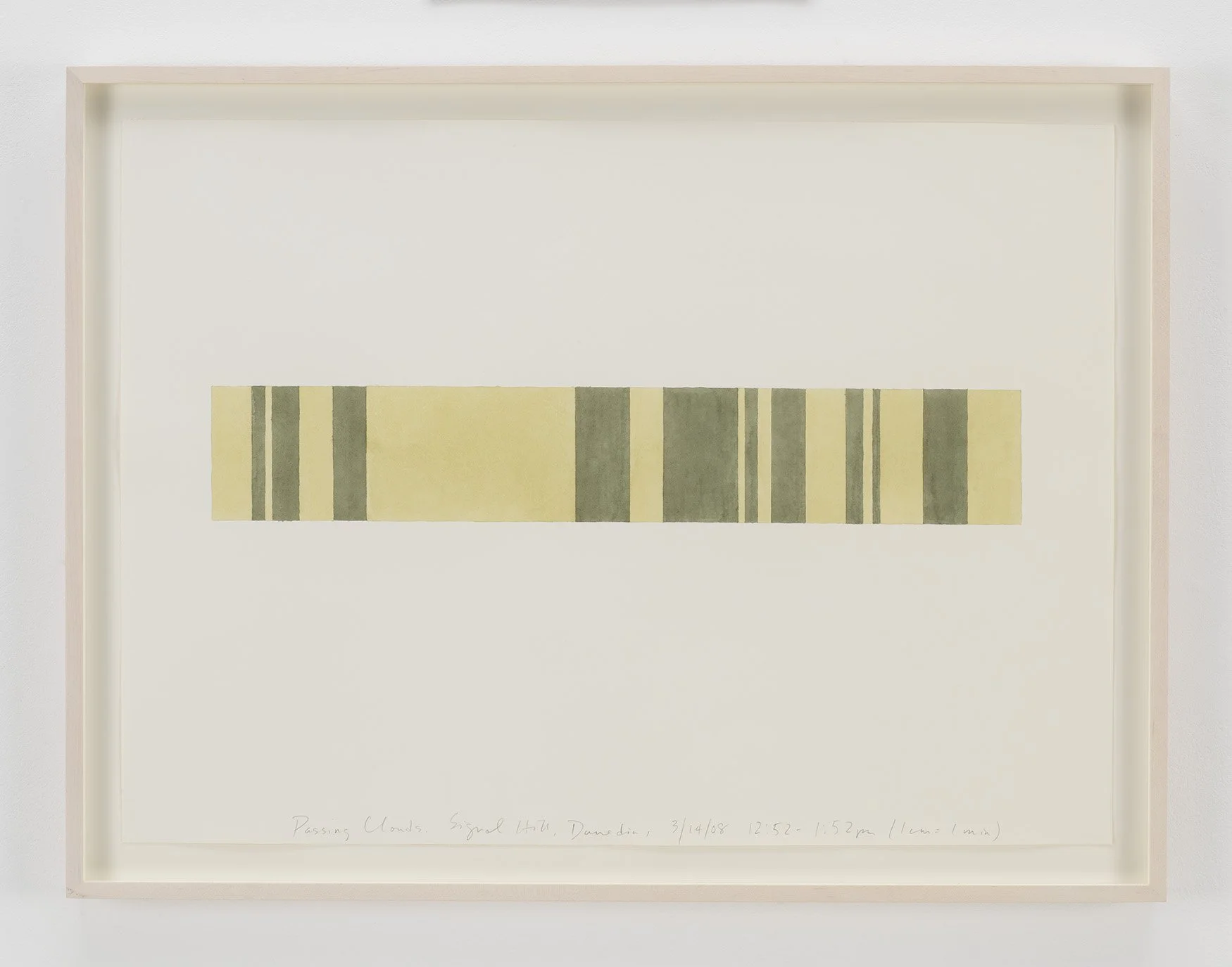 Study of the record of the light changing with passing clouds in a New Zealand harbor over the course of a single hour. Each centimeter equals one minute, from left to right, shifting between direct and indirect sunlight.