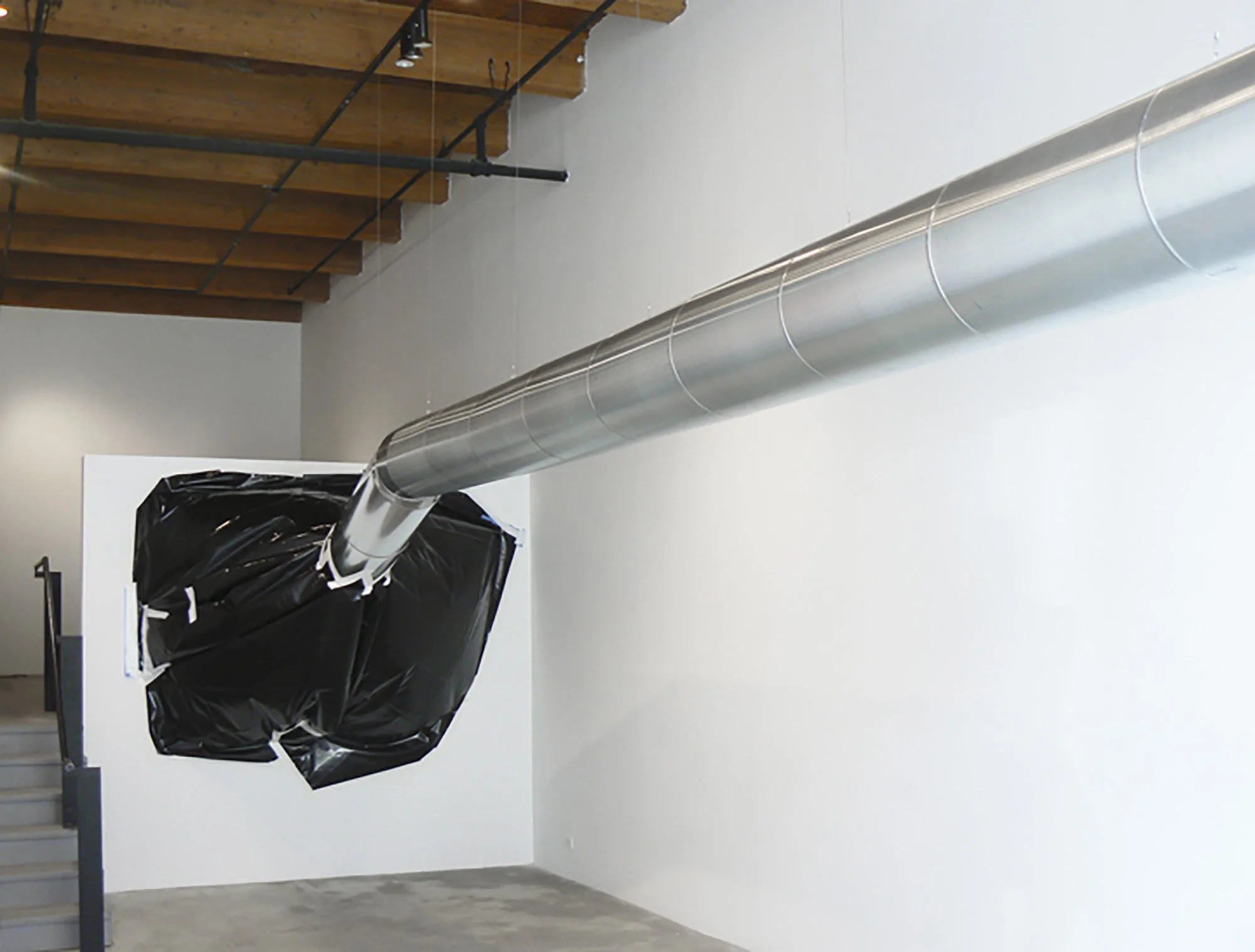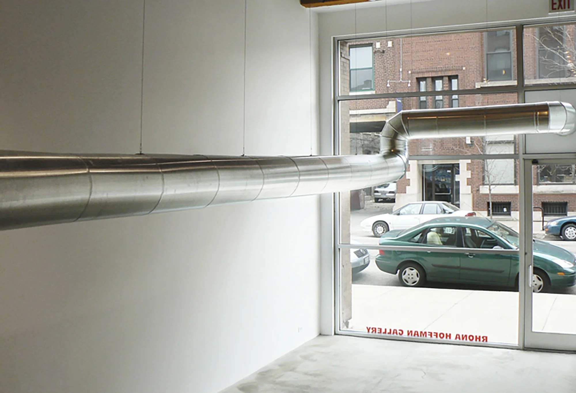 For this installation, a photographic device composed of mirrors and ventilation ducts extends from outside the gallery in order to expose a cyanotype directly on the gallery wall, creating a hazy blue image from a two-day exposure of the Chicago sky.