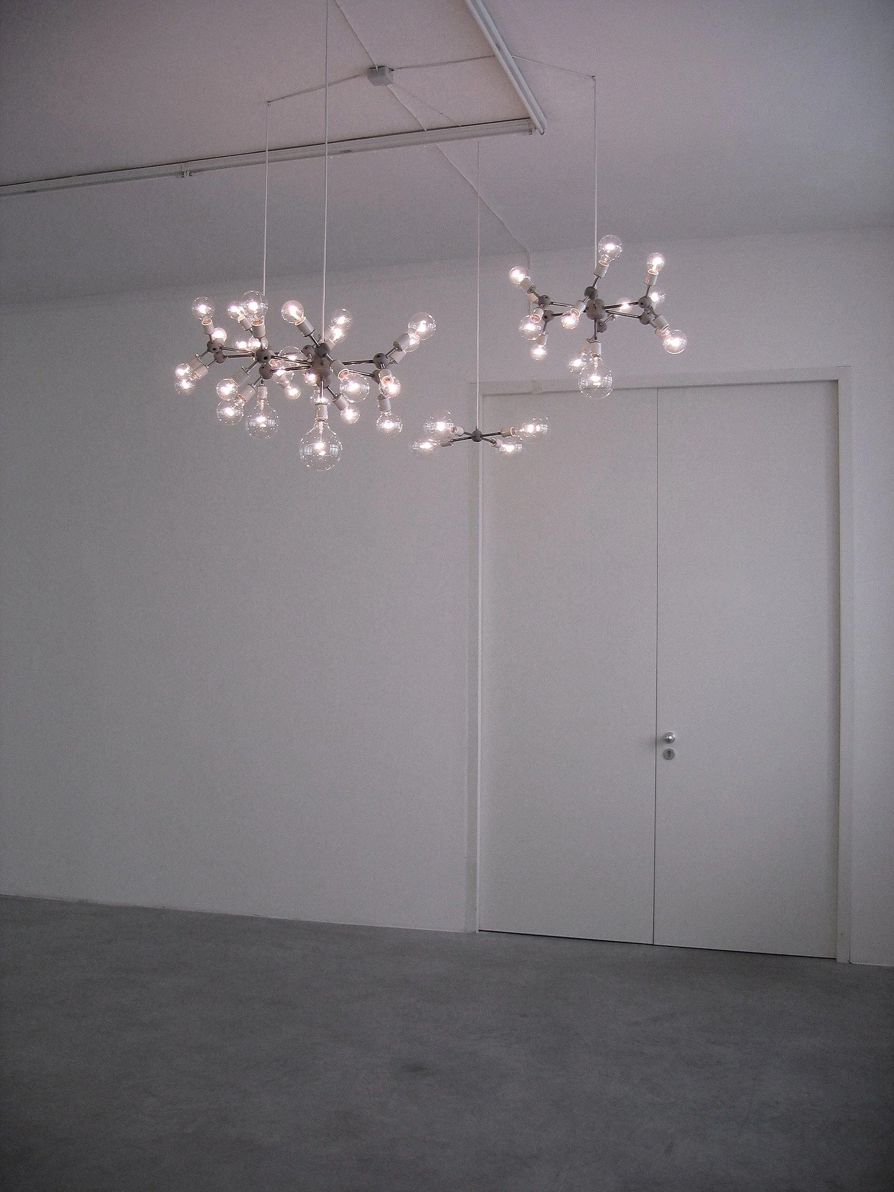 The hanging light fixtures of this installation represent the molecules that make up the pigment Prussian blue. Each individual lamp represents a single atom.