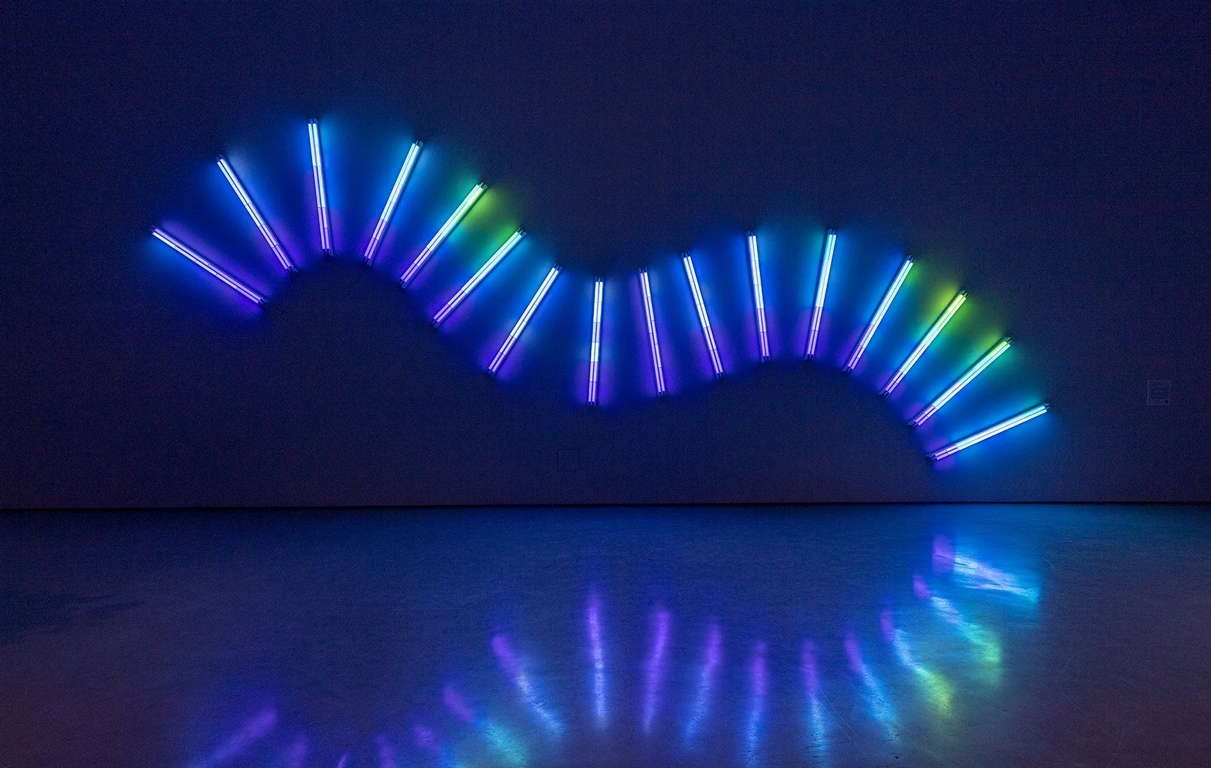 This LED lamp installation takes Reflets Dans L’eau, Claude Debussy’s composition for solo piano, as a starting point and inspiration. The pitches in the opening of the music have been translated into colors, with each vertical lightbulb representing a chord (a musical vertical moment). This work includes 26 colors, each representing a specific musical pitch and register, selected from a palette of blues, greens, and purples. These colors are representative of the water themes in Reflets Dans L’eau as well as Debussy’s association with French Impressionist painters, who often worked within a similar color world.