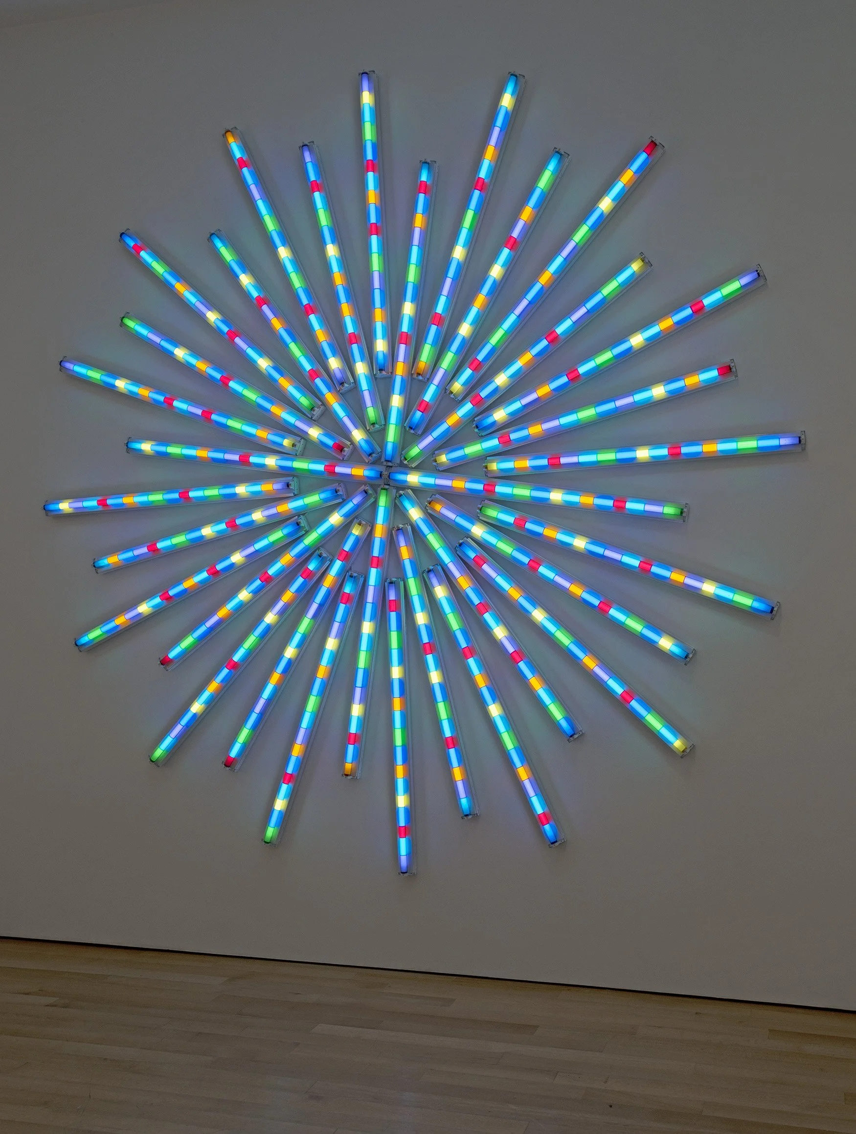 This work recreates the light morning light at Troy, as measured at the site of the ancient city (now in northwestern Turkey). The lamps are arranged in a radiating circle, referring both to the sun and the legendary shield made by the god Hephaestus.