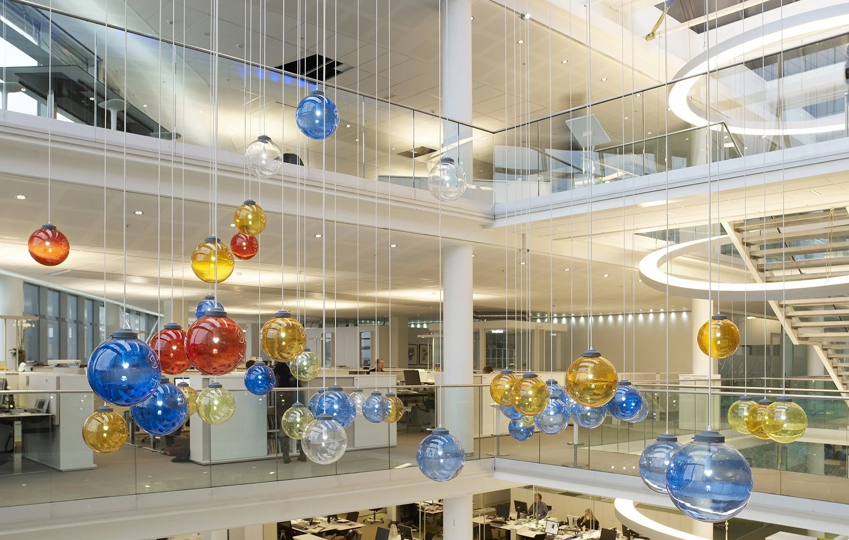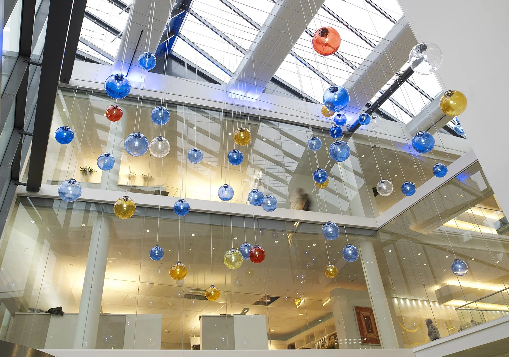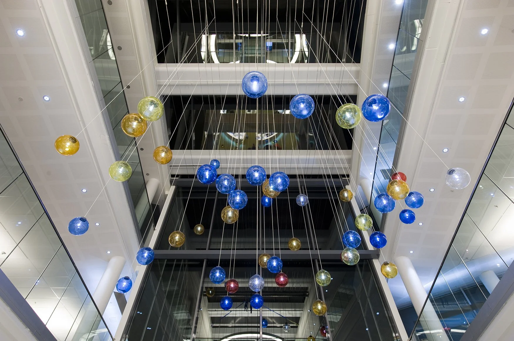 This installation consists of two three-dimensional star maps. The north atrium contains a map of the brightest 50 stars seen from the northern hemisphere and the south atrium contains the fifty brightest stars from the southern hemisphere. The location of each illuminated globe is determined by the star's location in the night sky and the height is determined by the star's distance from earth. The color of each globe refers to the wavelength of light that the star emits. The installation is powered via solar panels on the roof of the building.
