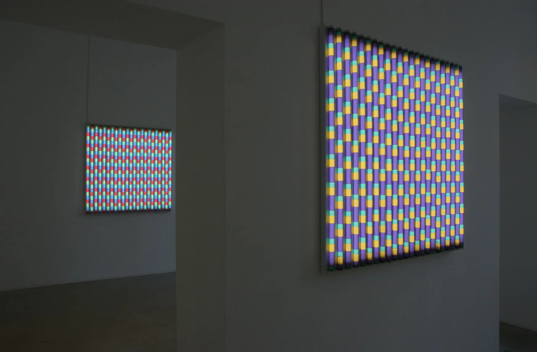 Each of the three diptychs that make up this work precisely recreate the natural light measured at mid day in Finch’s Brooklyn studio. The first diptych has red, green, and blue filters; the second has green, yellow, and violet; and the third blue, green, and orange.