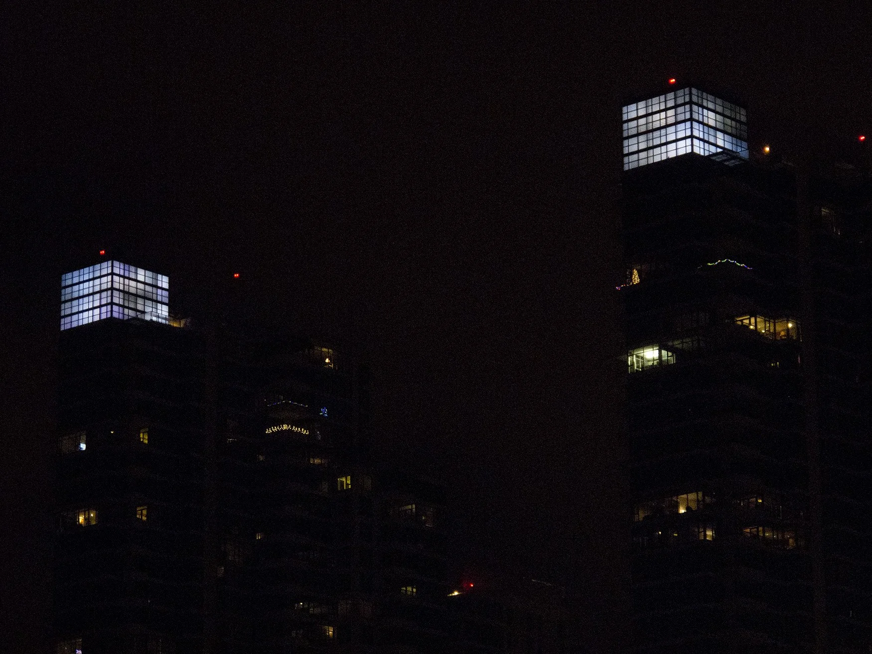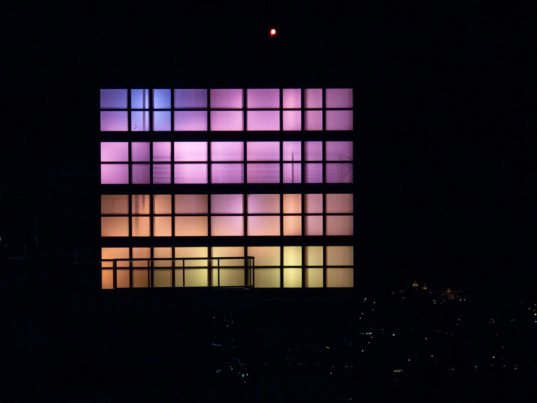 In this installation the lighthouses on the roofs of the Grande North and Grande South towers are illuminated to create “red sky” and “blue sky” lighting compositions each evening. The different compositions are determined by the weather forecasts for the next day; red for fine weather, gray for cloudy or rainy weather.